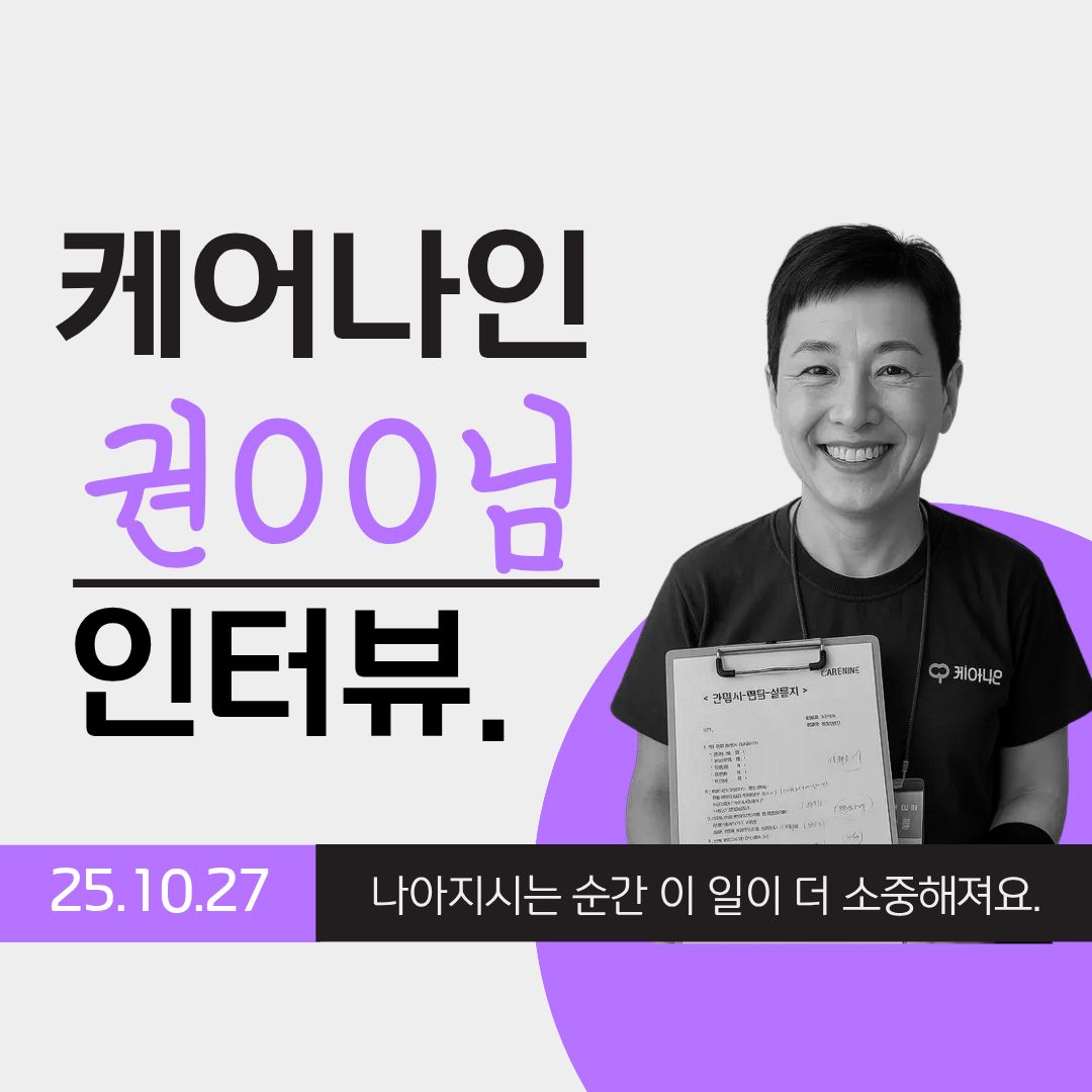 [ 25.10.27 케어나인 간병인 후기 ] 삼성서울병원 권OO[ 25.10.27 케어나인 간병인 후기 ] 삼성서울병원 권OO 🩺권OO 간병사님 🏥근무처 : 삼성서울병원 나이 64세 / 자격증 : 요양보호사 푸근하고 차분한 성격으로 환자분들이 편안해하며, 회복해 가는 모습을 지켜볼 때마다 “이 일이 참 소중하다”는 마음이 다시 생긴다고 해요. “케어나인과 함께 느끼는 간병의 성취” ✔ 환자분이 회복하실 때 큰 보람을 느끼고 ✔ 환자와 보호자가 친절하게 대해주시며 “일 잘해주신다”고 말해줄 때 힘이 나고 ✔ 인상 좋다는 말을 들을 때 간병사로서의 자신감이 더해진다고 해요. 케어나인 간병인 Real Interview 𝐐. 근무하면서 가장 힘들었던 점은 무엇인가요? 𝐀. 체중이 많이 나가시는 환자분을 케어할 때 체력적으로 힘이 들 때가 있어 어려움이 있었어요. 𝐐. 보호자분들은 보통 어떻게 대해주시나요? 𝐀. 대부분 친절하시고, 인상 좋다고 말씀해주시며 따뜻하게 대해주세요. 𝐐. 보람을 느낄 때는 언제인가요? 𝐀. 환자분이 건강을 회복해 가실 때, 그리고 보호자가 “일 잘해주신다”고 말해줄 때 가장 큰 보람을 느껴요. 𝐐. 간병 일을 오래 하고 싶은 이유가 있나요? 𝐀. 네. 앞으로도 계속 간병 일을 이어가고 싶습니다. 𝐐. 간병 일을 준비하는 분들에게 조언한다면? 𝐀. 환자에게 집중하고, 섬세하게 케어하는 마음이 가장 중요하다고 말씀해주셨어요.